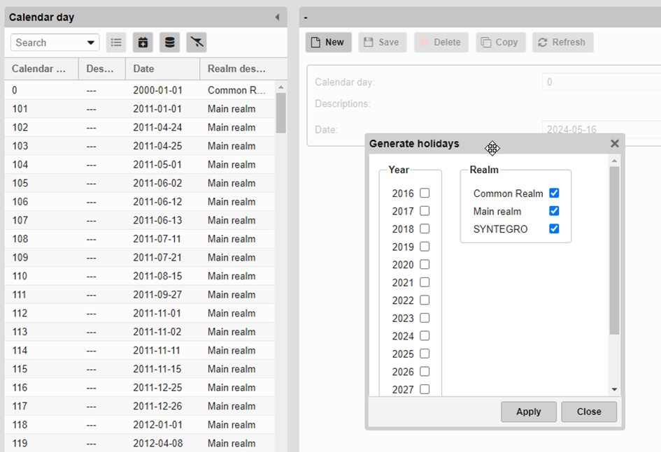 calendar days are created. Click for thisOn the iconThrough the iconYou can generate holidays. Indicate the year and click on"Apply."