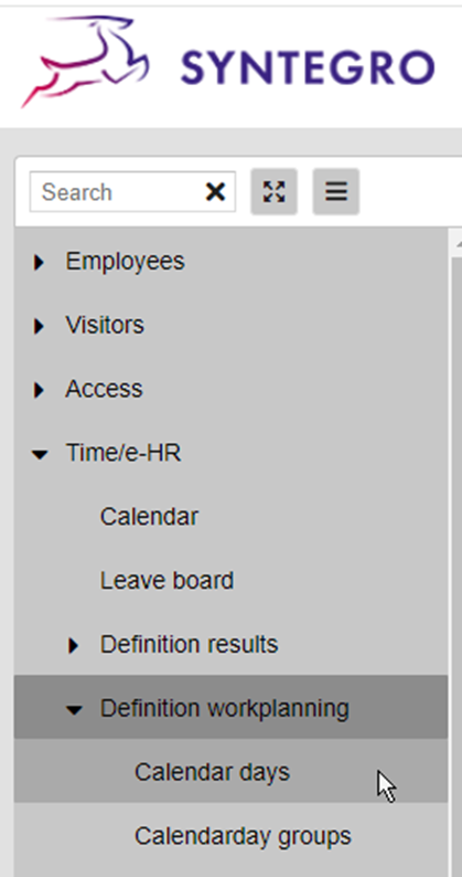 Via the menu "Time/e-HR" and menu item "Definition work planning" -"Calendar days" can