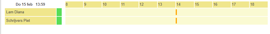 In de mode “Tijdsverloop tijd” kan je meer informatie verkrijgen over de afwezigheden. De gekleurde balk geeft aan op welke tijdstippen de afwezigheid is ingepland op basis van de theoretische ST-tijden in het dagrooster. De kleur van deze balk wordt overgenomen van de kleurcode van het dagresultaat dat is ingezet.