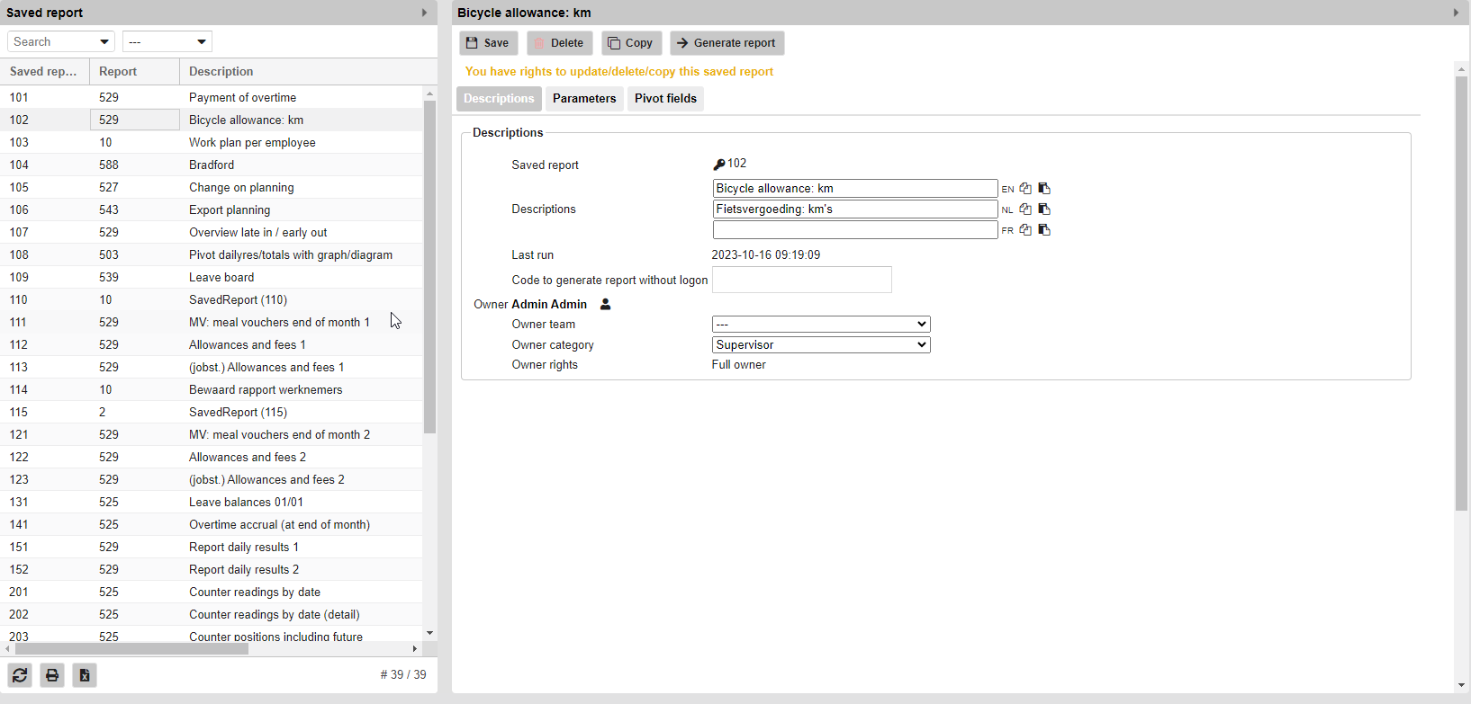 Voor "Bewaard rapport" kunt u het rapport met de huidige ingegeven parameters en geselecteerde outputkolommen bewaren onder een naam naar keuze.