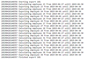 Dit opent een nieuw tabblad waarvan de inhoud gelijkend is aan volgend voorbeeld. Wanneer er geen foutcodes gegenereerd zijn, is de export geslaagd. Je kan het net gegenereerde exportbestand terugvinden bij het zwarte mapje naast ‘exportbestand’. Dit bestand kan je downloaden door te dubbelklikken. Ook hier kan je desgewenst een unieke bestandsnaam kiezen door de parameter "Uniek logbestand" te activeren."