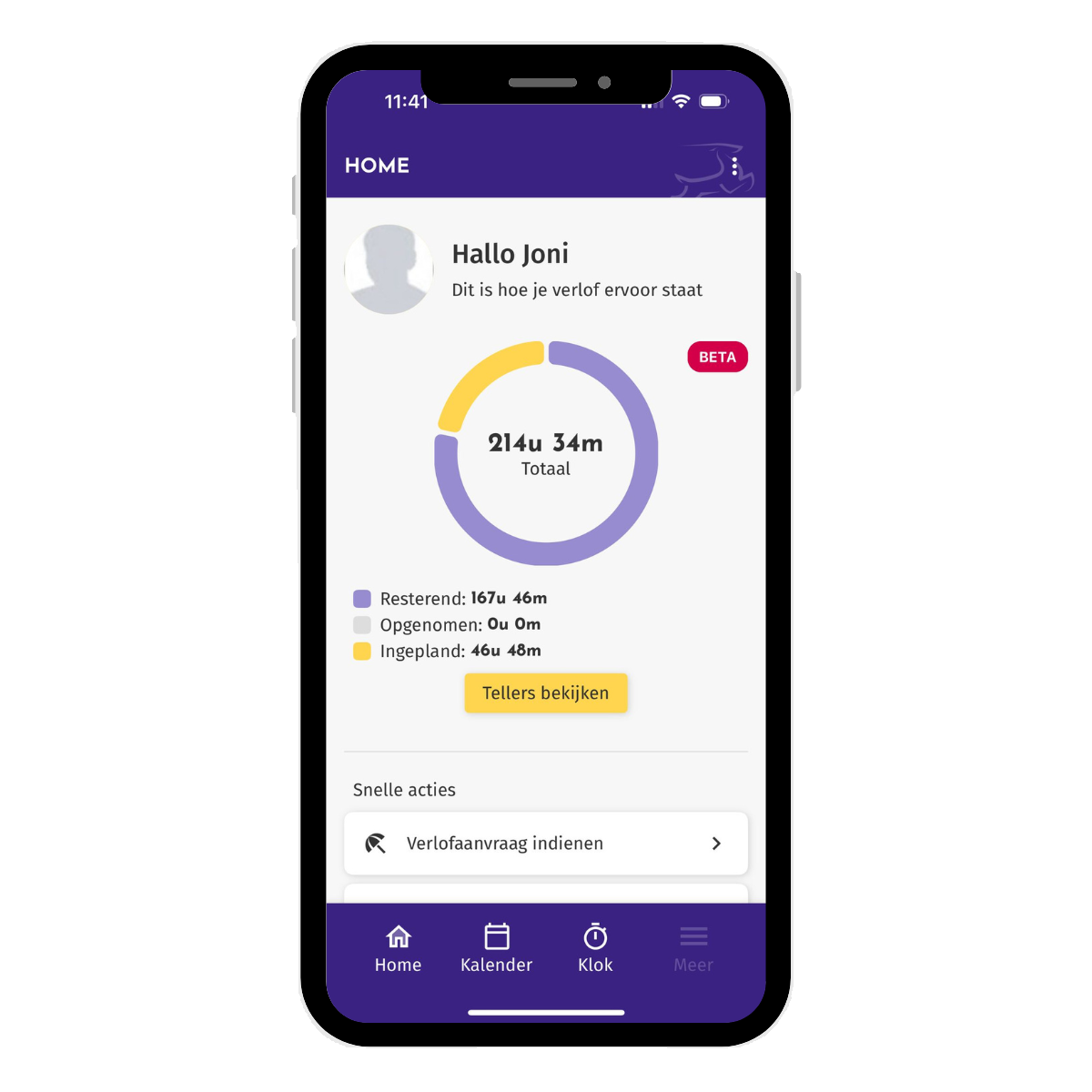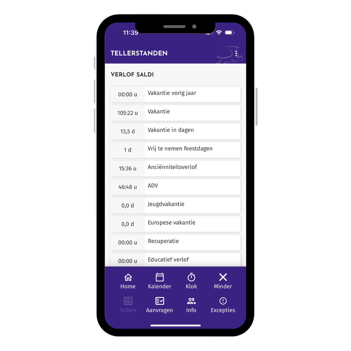 Klik op de knop 'Meer' vanuit het beginscherm. Navigeer daarna naar 'Tellers' en op deze manier kan je raadplegen hoeveel verlof of saldi je nog hebt.