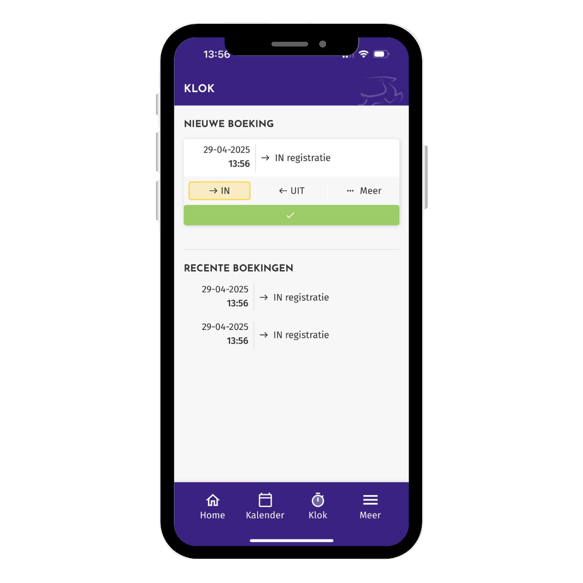 Je kan bij 'Recente boekingen' ook zien wanneer je hebt in of uitgetikt.