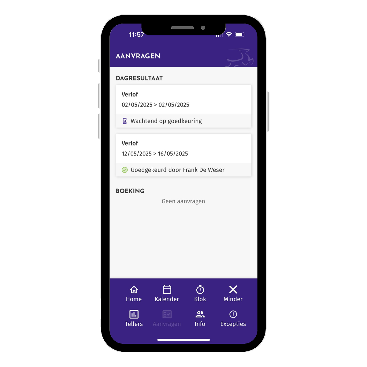 Klik op de knop 'Meer' vanuit het beginscherm. Navigeer daarna naar 'Aanvragen' en op deze manier kan je raadplegen of je aanvragen zijn goedgekeurd door je manager.