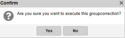 Een groepscorrectie is een heel ingrijpende gebeurtenis en daarom wordt er nog een extra waarschuwing gegeven. Dit scherm verschijnt om de gebruiker nog eens te laten nadenken of alle velden wel correct aangeduid werden. ‘Werden de juiste wit-oranje velden geselecteerd? Werden de juiste werknemers geselecteerd? Moeten de gegevens van het heden of ook van het verleden en/of de toekomst gecorrigeerd worden?’ Dit zijn belangrijke zaken die nog eens in vraag gesteld moeten worden alvorens de groepscorrectie definitief door te voeren.