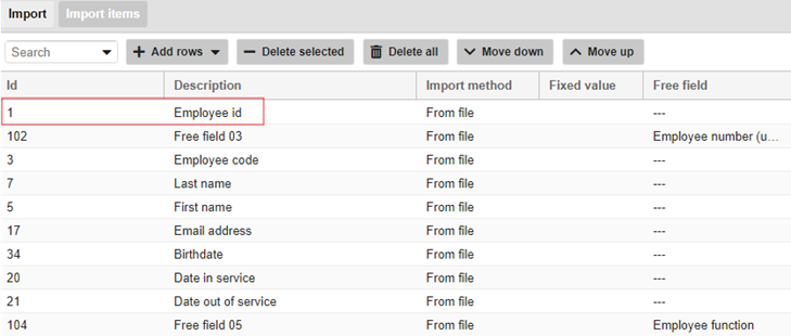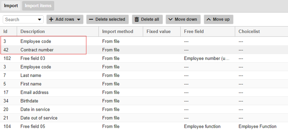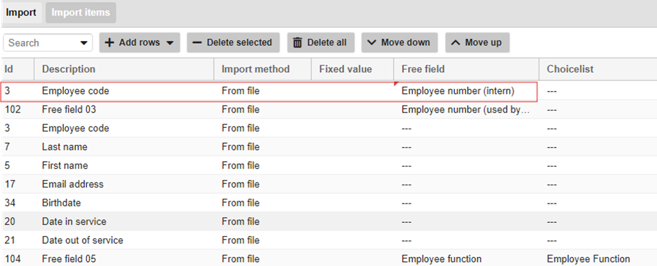 Hierna moet ditzelfde veld gedefinieerd worden bij import items achter ‘employee code’. De te importeren velden volgen ook hier in de rijen onderaan.