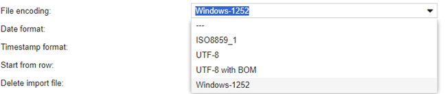 Bestanden kunnen aangemaakt worden met verschillende soorten karaktersets. Dit is vooral van belang bij het gebruik van speciale karakters. Wanneer een bestand vanuit Excel geïmporteerd wordt, is het nodig om in dit veld ‘Windows-1252’te selecteren.