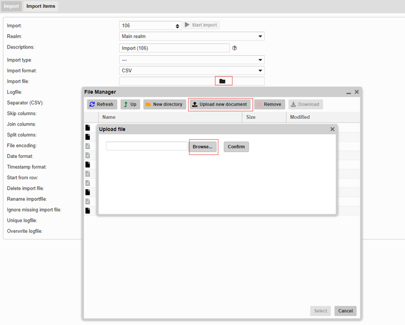 Via dit veld kan het bestand met de gewenste data opgeladen worden. Door achteraan op het mapje te duwen, verschijnt een pop-up venster. Via de knop ‘upload new document’, kan het juiste bestand gekozen worden waardoor het in de ‘file manager’ terechtkomt. Wanneer het juiste bestand tot slot geselecteerd wordt, verschijnt het achter ‘import file’.