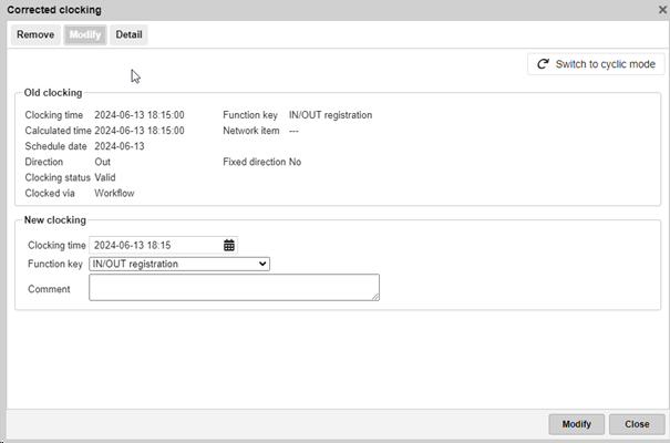 - Wijzigen: hiermee kan je het boekingstijdstip aanpassen. Een reden zou kunnen zijn dat een werknemer op tijd was maar te laat geboekt heeft maar toch al aan het werk was.