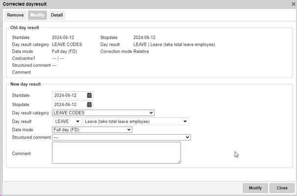 - Wijzigen: in het tabblad wijzigen kan je meerdere acties uitvoeren. Zo kan je het type dagresultaat aanpassen. Bijvoorbeeld van wettelijke vakantie naar ADV. De data mode kan ook aangepast worden. Zo kan je bijvoorbeeld een volledige dag vakantie aanpassen naar een halve dag.