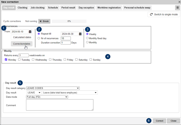 Zo kan je hier aangeven dat een bepaalde afwezigheid of correctie over een bepaalde periode telkens op maandag moet terugkomen.