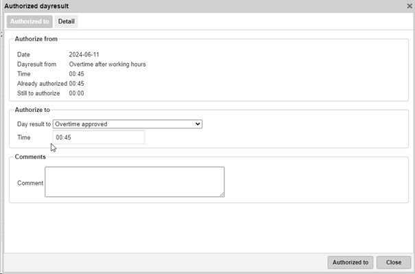 - Autoriseren naar: in tegenstelling tot de andere correcties kan je bij een autorisatie geen tabblad verwijderen vinden. Om de autorisatie uit het systeem te halen wordt de tijd op 00:00 ingesteld en op “autoriseren naar” geklikt. Op die manier gaat de autorisatie verdwijnen en terug zichtbaar worden in de kalender.