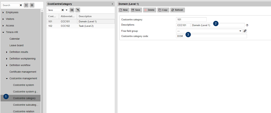 Als eerste stap bepaal je de kostenplaatscategorie(ën). Indien je meerdere levels hebt (Domein / Taak / …), kan je hier de verschillende kostenplaatscategorieën definiëren.